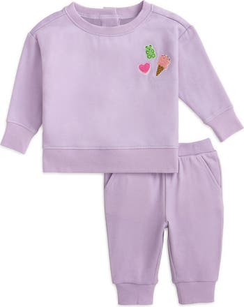 Playful, brightly colored appliqués decorate the front of of a matching set made from supersoft fleece perfect for cuddles or play.