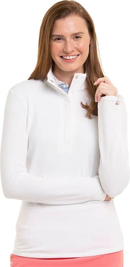 The Fairway & Greene Kate Old School Womens Golf Sweatshirt is a great layering piece that will keep you warm and cozy on and off the course. A simple placket with hidden snaps and a single exposed top gold button makes for a classic look. UPF 50+ will work to keep you protected from the sun's harmful rays so all you have to think about is your game.