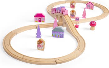 Choo-choo! The Fairy Pink Train Set is ready to depart to a magical fairytale land far, far away. Pinks, pastels and fairy figures feature extensively in this bright and wonderful wooden train set.The Bigjigs Fairy Train Set comes with 35 play pieces to ensure there's no limit to imaginative play. The cute train engine and colour coordinated carriages pass by pretty houses, trees and toadstools as they travel across the countryside.Additional accessories are available to expand this wooden railway set and Bigjigs Rail is compatible with most other major wooden railway brands. Made from high quality, sustainably sourced FSC® Certified wood. Conforms to current European safety standards.