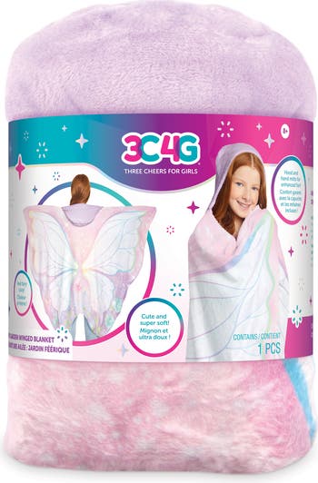 3C4G: FAIRY GARDEN WINGS BLANKET - Feel like a fairy in this in cozy hooded blanket with hand mitts! Super comfortable and perfect for bringing fairy imagination to life. The coral fleece material and large wing shape make it perfect for both curling up and enhancing playtime with fairy fun. An excellent gift for fairy-loving tweens, no matter the occasion. The fairy wing design is irresistibly cute and ideal for snuggling in. Enjoy a good book in winged warmth, watch a fairy movie and feel like a part of the fun! The fairy wing and floral print with an array of fairy colors gives the blanket a special touch. Three Cheers For Girls - Make It Real.
