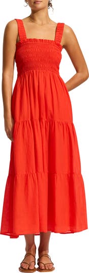 Keep it breezy and effortlessly polished in this cotton cover-up midi featuring a smocked bodice and flowy, tiered skirt—it even has pockets for stashing seashells.
