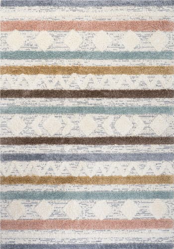 Right on trend, this rug features textured stripes and Moroccan geometric shapes woven in Boho-inspired pastels and earthy shades. Versatile rug features two different pile heights for soft texture in the living room, bedroom or home office. Woven from easy-care yarns, the family-friendly pattern adds texture and soft color to mid-century, transitional and modern interiors.