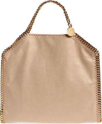 A shimmering faux-leather tote trimmed in gilt chains redefines modern luxury with its animal- and eco-friendly fabrication. Top carry handles and a longer chain strap add carrying versatility to the style, while a logo-etched disc is the perfect finishing touch.