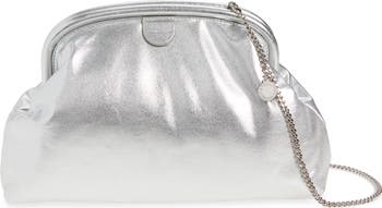The label's original cruelty-free bag is handcrafted by Italian artisans using metallic faux leather in a clutch style that converts to a crossbody. The softly structured style is accompanied by the iconic diamond-cut chain and features a satin lining made from post-consumer recycled polyester.