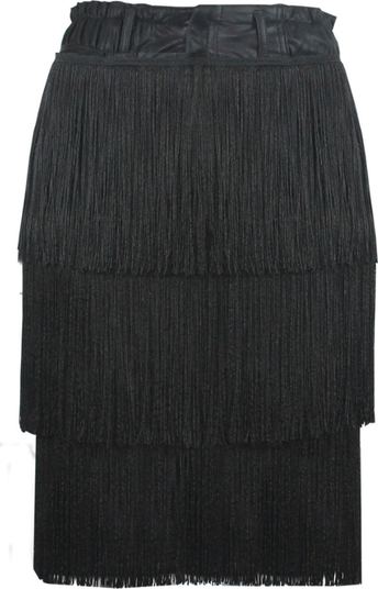 Tube-style skirt made of stretch faux leather, which conforms to the body, enhancing the silhouette with a sophisticated finish. It features layered fringes that add movement and texture, plus an elastic waistband with belt loops, ensuring comfort and a perfect fit.