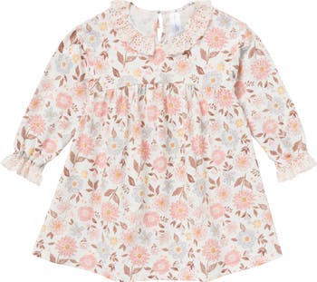 - Made from 100% cotton to be gentle on sensitive skin,Soft, breathable fit with textured feel,Simple pull-on style with faux wood button at back of neck,Boutique-style eyelet ruffle around collar and at wrists,Off-white with pink and blue flowers
