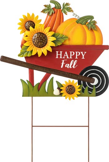 A clever wheel barrow pumpkin yard stake that comes in an exquisite finish with rich color. Featuring laser cut sunflowers and pumpkin. Premium material with fine workmanship ensures its durability and practicality. It is a unique and playful addition to your home's exterior decor and easy to anchor anywhere in your yard or garden.