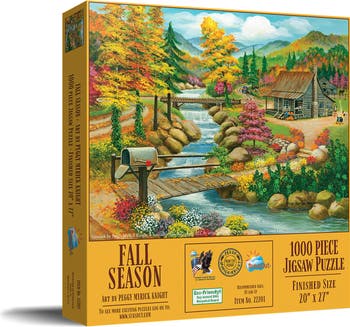 Indulge in the autumnal hues with the Fall Season 1000 Piece Jigsaw Puzzle by SunsOut Puzzles, capturing tranquil landscapes in the enchanting artwork of Peggy Myrick Knight. Made in the USA, this 20" x 27" masterpiece is crafted with precision using interlocking technology for a snug fit, and high-quality recycled cardboard for durability. SunsOut caters to eco-conscious puzzlers through its use of soy-based inks and recycled board, ensuring sustainability without compromising on quality. As a woman-owned small business, SunsOut is committed to delivering not just a pastime, but works of art that combine beauty, durability, and ethical production. They guarantee peace of mind with their worry-free commitment to excellence and their legacy of quality promise an enriching, unforgettable experience. Ideal for adults, this puzzle offers an escape from everyday life, fostering mindfulness and serenity; it makes a fitting gift for nature and art lovers. Dive into the captivating world of puzzles with SunsOut and create unforgettable memories, one piece at a time, with the amalgamation of art and nature in their jigsaw puzzles.
