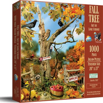 Dive into the rich hues of autumn with the Fall Tree 1000 piece jigsaw puzzle, a piece of captivating artwork by Lori Schory that immerses you in nature's splendor. Measuring 20" x 27", this SunsOut jigsaw puzzle is made with high-quality, recycled cardboard, with each piece interlocking seamlessly, ensuring a satisfying and frustration-free assembly. With a commitment to excellence and customer satisfaction, SunsOut's products are not only durable but also guaranteed. This eco-friendly puzzle is produced using soy-based inks and recycled board material, supporting sustainable practices. Made proudly in the USA, it embodies high manufacturing standards while being a testament to supporting environmentally conscious production. With a dedication to artistic integrity, the puzzle features fully licensed artwork from Lori Schory, capturing the true essence of fall from playful squirrels to rustling leaves and serene woodland creatures, providing hours of delightful discovery for both art lovers and puzzle enthusiasts. With a full-color display box, the Fall Tree puzzle makes for an ideal gift for birthdays, holidays, or just a surprise for a loved one, promising lasting memories and a stunning masterpiece. With the Fall Tree 1000 piece jigsaw puzzle, experience the beauty of fall anytime and create memories with loved ones while promoting eco-consciousness through this truly exceptional puzzle experience.