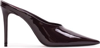 Pointy toe chocked-up mule, set on a pin stiletto heel. Made with smooth patent finished leather.