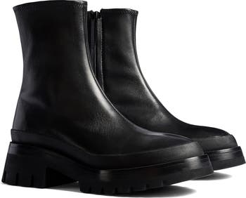 A chunky lug sole with an extended bumper grounds this sleek ankle boot made in Italy from soft lambskin leather infused with stretch for lasting comfort.