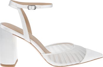 Fallon by HARLO is a delicate ivory heel featuring soft pleated tulle and a satin-capped pointed toe, designed to bring romantic charm to your wedding day. The slim ankle strap and open heel silhouette offer timeless appeal, while the refined 3.35in block heel provides a graceful lift without compromising stability. Please be advised: To protect the leather soles of this shoe, your shoes will arrive with a clear protective film. Please remove this film once you’ve decided to keep them.