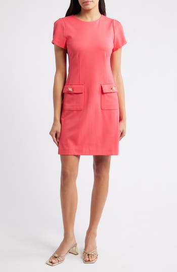 A sophisticated and sweet sheath dress is updated in a leggy length and accented with glinting floral hardware.