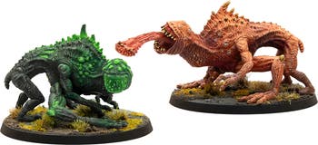 FALLOUT: MINIATURES - CRYPTIDS - SNALLYGASTERS - This miniatures set is part of THE WILDS OF APPALACHIA wave for Fallout: Miniatures. “The horrifying result of experiments with the experimental Forced Evolutionary Virus, the snallygaster has six limbs, numerous eyes along its back, and an extended tongue covered in acidic goo that can rapidly take down any survivors.” The first stable creature mutated with the FEV, a strange cocktail of different attributes and animal genomes, these creatures were described as disturbing by their original creators. Despite this, the snallygaster was hailed as a massive success, providing invaluable insight into the workings of the FEV and giving hope to the scientists who had yet only seen failure. Though plans were made to release this specimen into the wild after it reached maturity, the Great War expedited the plan when it escaped captivity from a now-abandoned facility. OFFICIALLY LICENSED: This miniatures set is part of THE WILDS OF APPALACHIA wave for Fallout: Miniatures. 2024 Bethesda Softworks, a ZeniMax Media company. All Rights Reserved. INCLUDES: 2 Miniatures, 2 Bases. Unassembled, unpainted, resin, RPG, tabletop roleplaying game figures.
