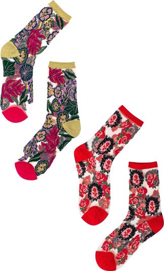 Fancy Assorted 2-Pack Metallic Floral Sheer Crew Socks