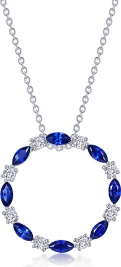 An open circle pendant symbolizes endless love with simulated diamonds and lab-grown sapphires sending a passionate message on this sterling silver necklace.