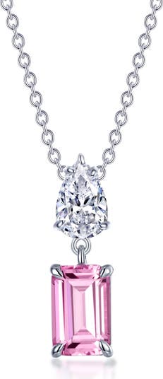 An emerald-cut pink sapphire shines beneath an equally brilliant simulated diamond on this polished necklace rendered from sterling silver bonded in platinum.