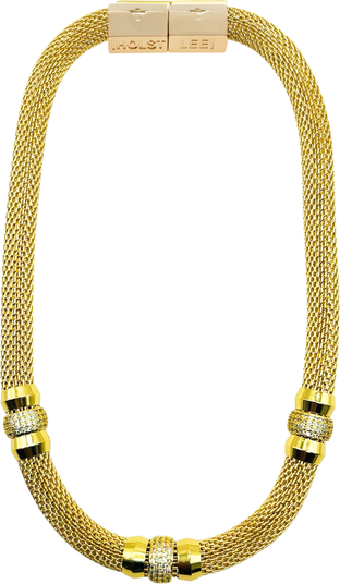 - Designed with 18K gold-filled hardware, this necklace features gold-plated, nickel-free mesh and our signature magnetic clasp.