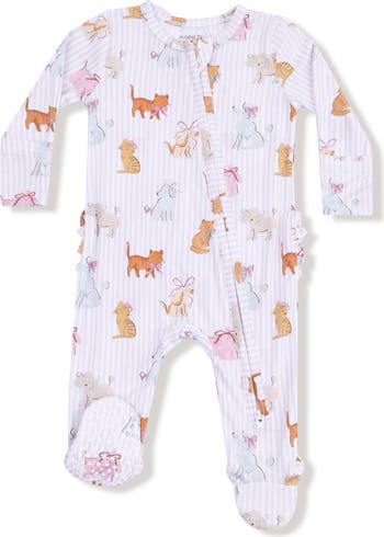 An adorable pattern details this ruffled footie featuring gripper feet and a two-way zipper to make diaper changes a little easier.