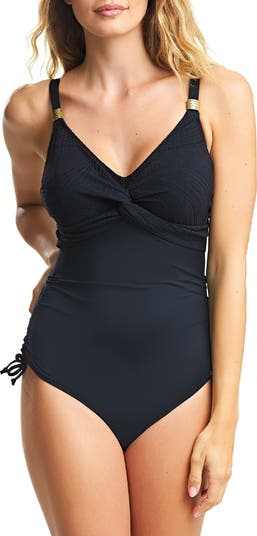 A twist-front one-piece with underwire cups is fashioned with intricate jacquard knit and adjustable side ties that allow you to lower or heighten the legs.