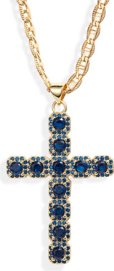 Colorful round cubic zirconia cluster on this eye-catching cross pendant set on an 18-karat gold-plated chain with intricate etchings.