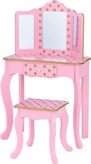 Little ones will love getting ready at this vanity that comes with a light-up mirror, drawers for organization and a matching stool covered in cute polka dots.