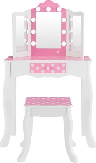 Little ones will love getting ready with this vanity that features a pretty polka-dot bench plus a vanity table designed with a built-in drawer and movie-star lighting.