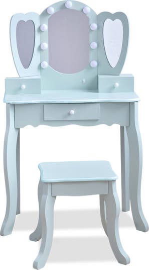 Includes: Table with an acrylic oval mirror surrounded by LED lights, a stool, a storage drawer and tabletop bins (AAA batteries not included)