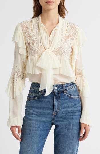Inspire sonnets in a deeply romantic button-up decked in ruffles and embellished with dainty embroidery.