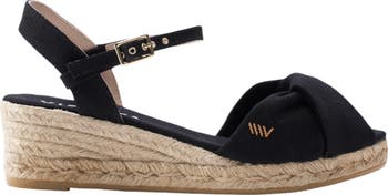 Farella: low wedge ankle strap espadrille sandalsStep out in style in our beautiful Farella wedge espadrilles. These low wedges have an all natural 2” jute wedge heel, a beautiful ankle strap, and an open toe with an elegant knot for an extra touch of glamor. With their soft, cushioned insoles, natural jute and 100% organic these beauties are both cute and comfortable. And the lovely thick knot will help to keep a firm grip on your foot.