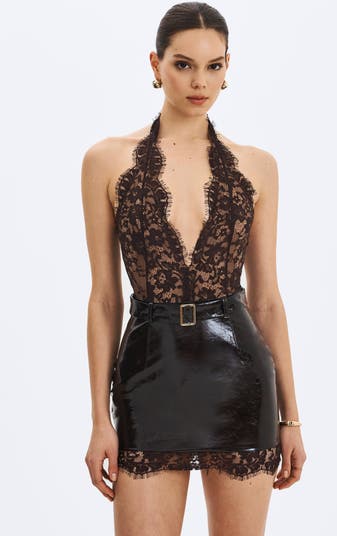 Turn up the heat this Valentine’s season in the Faris Dress, a sultry blend of plunging lace halter romance and high-shine mahogany patent attitude. The backless silhouette and lace-trimmed mini skirt strike the perfect balance between sweet and daring, while the removable faux leather belt with its gold buckle adds a polished touch of edge. Fully lined in nude mesh and finished with shank buttons at the neck and an invisible back zipper, it’s designed to sculpt and flatter in all the right places. A confident pick for date nights, celebrations, or any moment that calls for something effortlessly bold. Also available in a midi length, the Fiera offers an elegant take on the same signature silhouette.