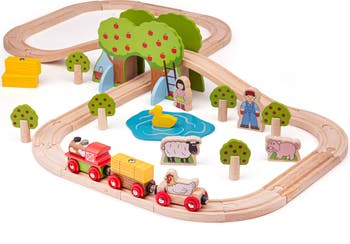 - 44-piece train set with wooden track, an engine and 2 colourful carriages, apple orchards, a duck and pond, animals, hay bales and more