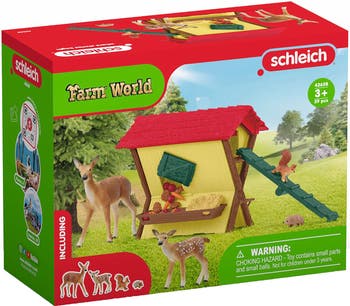 FARM WORLD: FEEDING THE FOREST ANIMALS - What can the Red Deer doe and her sweet calf find in the feeding trough? While they are enjoying their lunch, the squirrel and hedgehog have also stopped by for a snack. Because of the removable roof, you can see immediately whether there is still enough food and hay in there for all of them. To make sure that even the smallest animals can get to the food, there is even a ramp! he Red Deer Doe and her calf are happy about the food pellets, but they both also enjoy crunchy carrots. The shy hedgehog also likes to come by. The squirrel slips curiously through the feed hatch into the manger. Maybe it will find a nut? In any case, it has found a cozy hiding place under the roof. Dimensions: 4.7 x 4.9 x 3.9 inch Inspiring figurines to play imaginatively and freely. So authentic, so detailed, even mother nature approves. High-quality craftsmanship to withstand father time. SCHLEICH: As an 85-year-old German toy company, we are committed to manufacturing realistic toys with the highest standard of quality and safety for years of durable play and collectability. All products and the materials used meet or exceed the strictest applicable toy safety requirements.