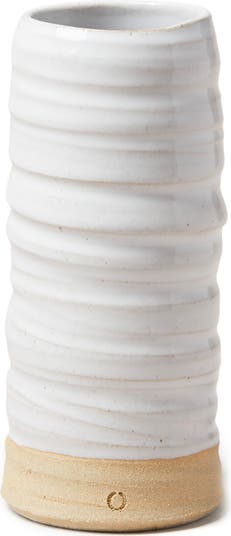 Irregular striations further the easy, rustic appeal of a vase that's crafted in America from durable stoneware finished with an opaque, milky glaze.