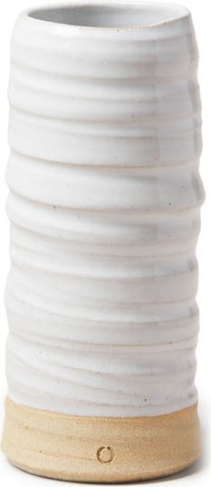 Irregular striations further the easy, rustic appeal of a vase that's crafted in America from durable stoneware finished with an opaque, milky glaze.