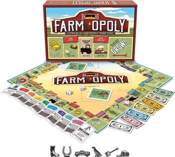 The Farm-Opoly is a property trading game for farmers or those who just think farming is cool. It's life down on the farm where players increase their profit by collecting acres and trading them in for big red barns. Full of country humor and an occasional fun fact, farm-opoly is a celebration of an All-American way of life. Late for the Sky Farm-Opoly Board Game is designed for all ages, Adults and Children.
