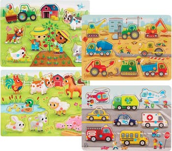 2 years & up. Explore, match, and learn with the Farmyard Animals & Transportation Vehicles Peg Puzzles! Each set of wooden peg puzzles includes two sturdy boards with 16 easy-to-grasp pieces featuring colorful scenes from farm life and transportation. Toddlers can meet friendly animals like cows and horses, then head into town with dump trucks, taxis, and more. Underneath each piece is a matching picture to guide independent play and build confidence. Designed for little hands, these puzzles help develop fine motor skills, hand-eye coordination, and early problem-solving through engaging, hands-on fun. Includes 2 Farmyard Animals and 2 Transportation Vehicles puzzles.