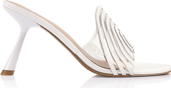 Introducing Farrah, the sandal that turns minimalism into a statement. Crafted in white patent leather and clear vinylite, the soft square-toe design is elevated by a bold horizontal striped upper that plays with texture and transparency. Set on an angled stiletto heel, Farrah is made to shine at weddings, bridal events, or any special occasion where style matters.