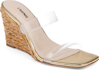 A pair of translucent straps and an angular square toe add futuristic flair to an espadrille-inspired slide sandal lifted by a raffia-wrapped wedge heel. Memory foam cushioning delivers optimal underfoot comfort.