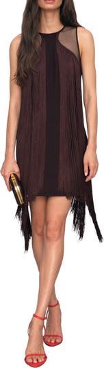 Lengthy fringe adds swingy movement to this party-perfect sleeveless mini framed by sheer mesh accents.