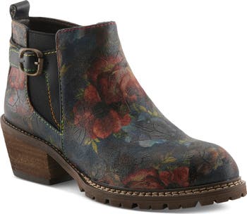 Aged-finish hardware and hand-painted leather bring artisanal charm to a whimsical bootie grounded by a stacked heel and durable lug sole for enhanced traction and stability.
