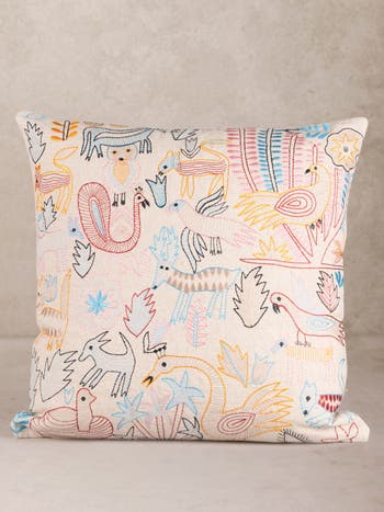 The Fateh Throw Pillow embodies the unmatched craftsmanship of Rajasthan, showcasing a vibrant tapestry of colors and intricate designs. Expertly embroidered by master artisans, each stitch tells a visual narrative filled with animals, birds, and flourishing flora, transforming delicate fabrics into a captivating work of art that reflects the rich cultural heritage of India. This multicolored pillow adds depth and elegance to any space, making it the perfect accent for your home. Owning this exclusive piece means embracing the artistry and creativity of skilled artisans, allowing you to transform your living area into a sanctuary of refined taste and vibrant storytelling.