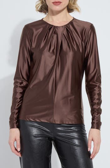 Stretch satin jersey elevates any look in a long-sleeve top that features elegant mini pleats at the neckline to play up the drape and shine.