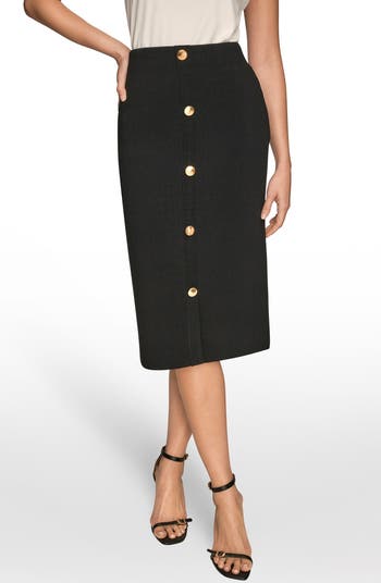 Classic details like a structured knit and a pencil silhouette make this polished faux-button skirt a timeless wardrobe workhorse.