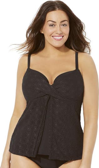 You’ll love the flowy, sun-goddess vibe of our faux flyaway tankini. Noted for its beautiful crochet detail, flirty twist-front sweetheart neckline, supportive features like a built-in underwire bra, and adjustable straps to adapt the shape perfectly for your body. Pair it with your favorite swim bottoms for your own unique look.