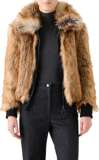 A ring zipper pull references the Swiss label's signature dot motif on this faux-fur bomber jacket with all the luxe swagger of the real deal.