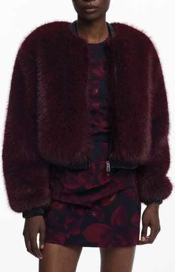 Up your faux-fur impact with this burgundy-hued jacket cut in a cropped bomber style and trimmed with thick ribbing.
