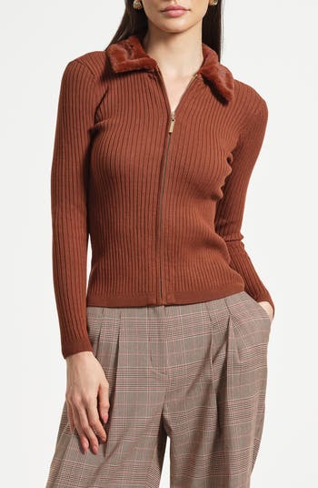 A sporty zip slices down the center of this close-fitting cardigan made with wide ribbing and topped with a fluffy faux-fur collar.