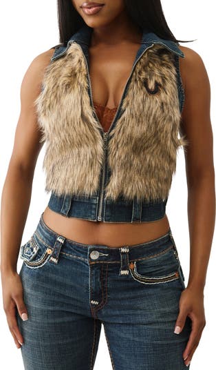 Make a statement in this fitted denim vest detailed with plush faux-fur front panels and a logo motif on the chest. Designed to be worn on its own, it blends soft texture with an edgy silhouette for a look that's equal parts daring and distinctive.