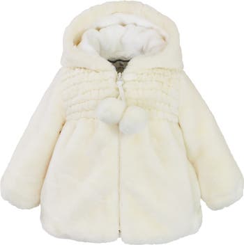 Soft faux fur hooded jacket is sweet and cozy. Easy zipper closure and fully lined in faux fur.